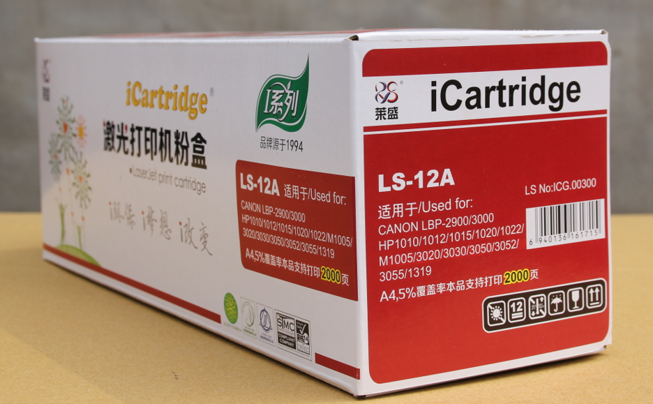 品牌萊盛I系列打印頁數(shù)2000頁型號LSIC-Q2612A打印幅面A4(5%覆蓋率)顏色黑色保質(zhì)期18個月適用于惠普1010/1018/1020/1022/3015/3020/3030/3050/3055/M1005,佳能LBP2900/3000打印機(jī)